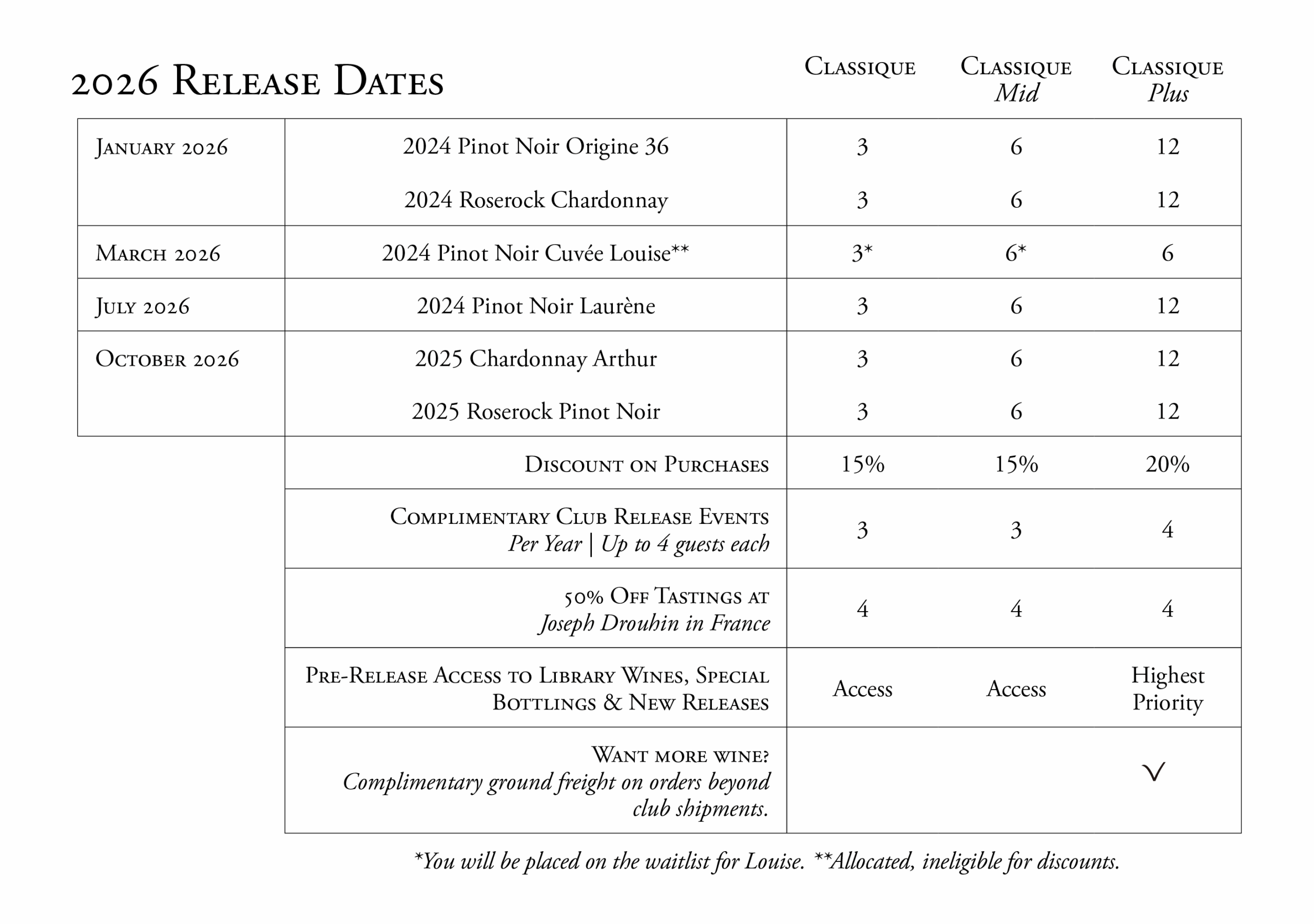 Our Pinot Noir Louise is allocated, and as a new member, you will be placed on a waiting list. Once available, you will automatically receive an annual allocation and it will increase your annual cost. Allocations may vary based on vintage production.